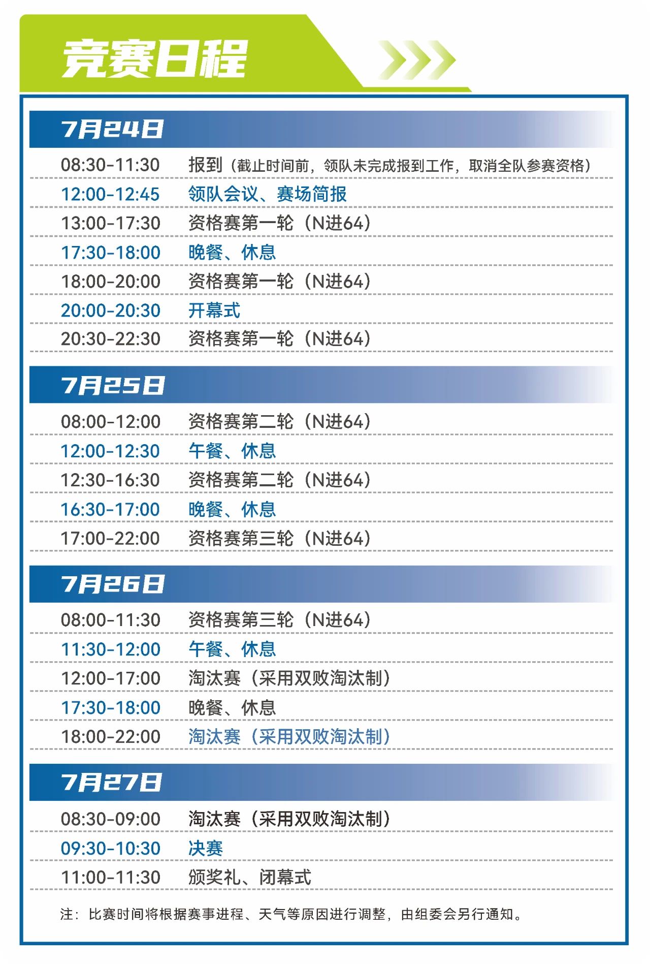 (一)报到时间:2024年7月24日(08:30-11:30),截止时间前,领队未完成报到工作,取消全队参赛资格。